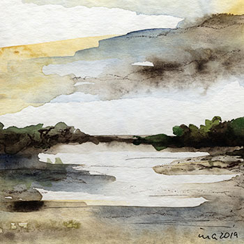 Am Aquarell begeistert mich immer wieder, auf welche Weise Pigment und Wasser eine Eigendynamik entwickeln, sich verdrängen oder miteinander verschmelzen. Bei kaum einer anderen Maltechnik ist das Zusammenspiel von Strategie und Unvorhersehbarkeit so stark ausgeprägt. Der finale Reiz dieser Arbeiten liegt in den diversen Interpretationsmöglichkeiten.